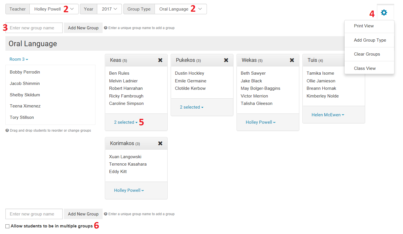 4. Drag and drop students' names from the class list on the left into the appropriate group, OR click on the cog, select Class View, then click on a student name from the class list to add them to the specified group. Change the specified group by clicking on the blue arrow by the group name. All changes are automatically saved.