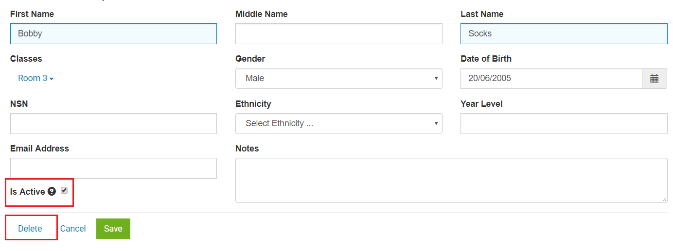 3. Once in your student details look for the Is Active tick box and untick it, then click Save. To remove a student completely click on the option Delete which is at the bottom of your student details.