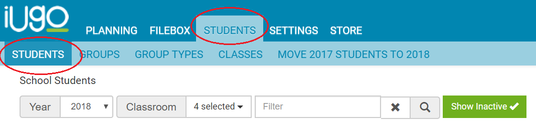 1. Click on Students in the dark blue menu then Students again in the light blue menu to access your classroom list.