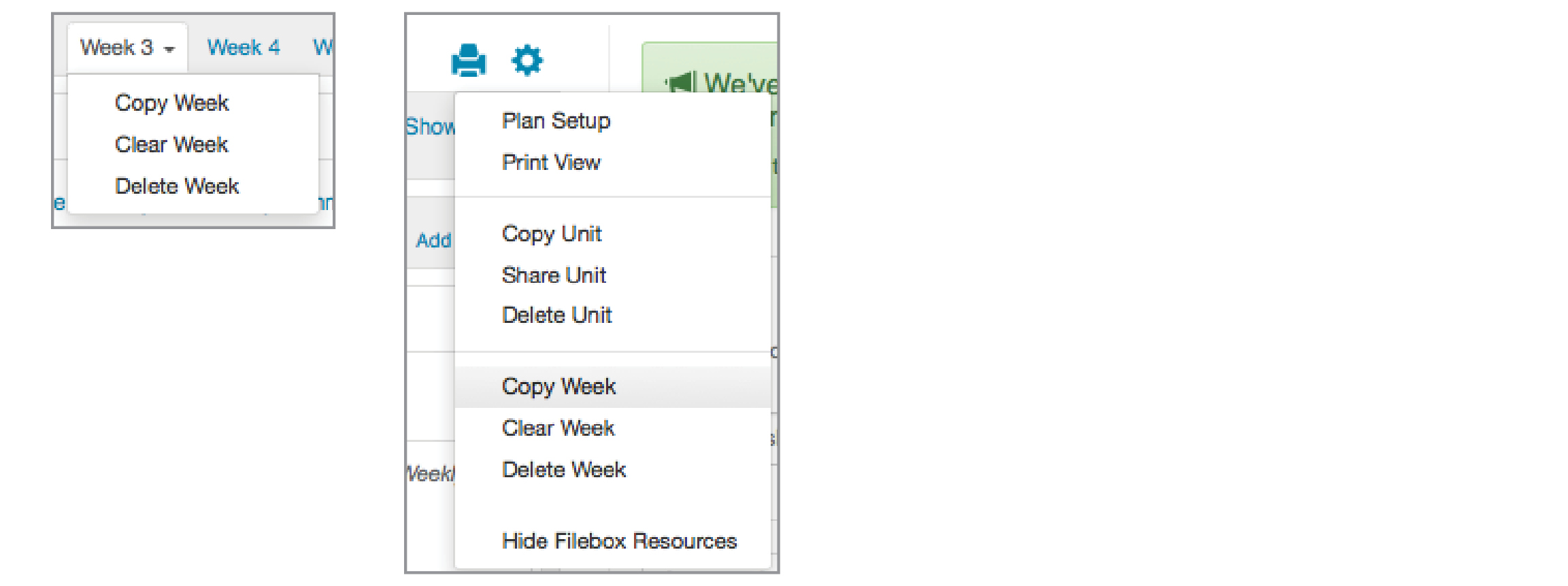 You can copy Lessons from week to week from either the Blue Cog or the Small Triangle beside the open week.