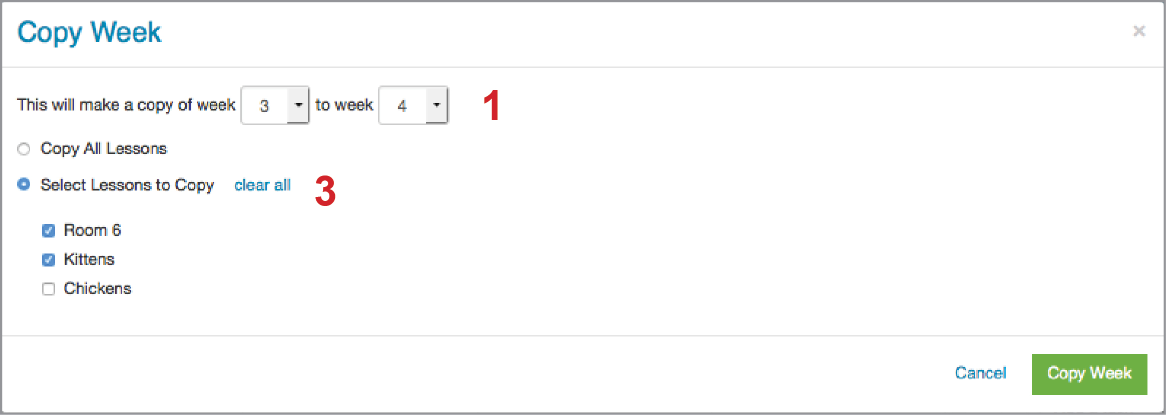 - Click Copy Week. You will have copied your Lesson/s, your students and their levels into the new week and can alter them to suits your needs.