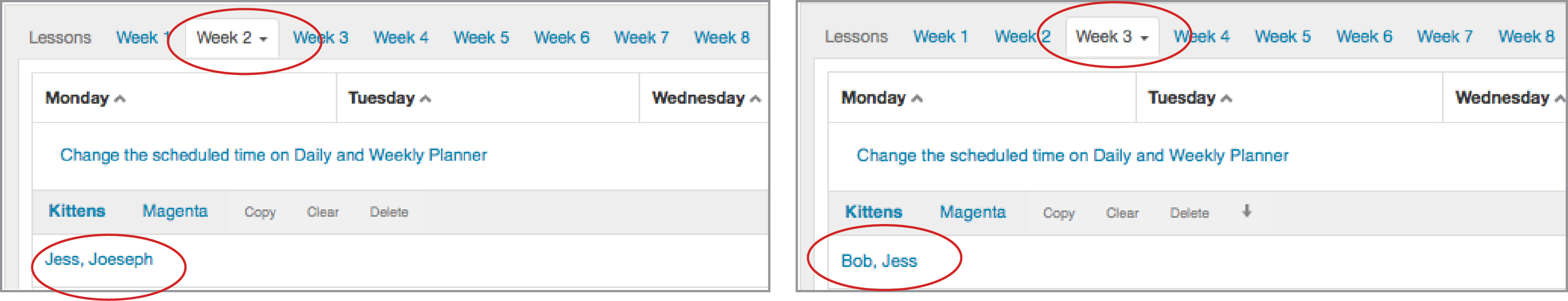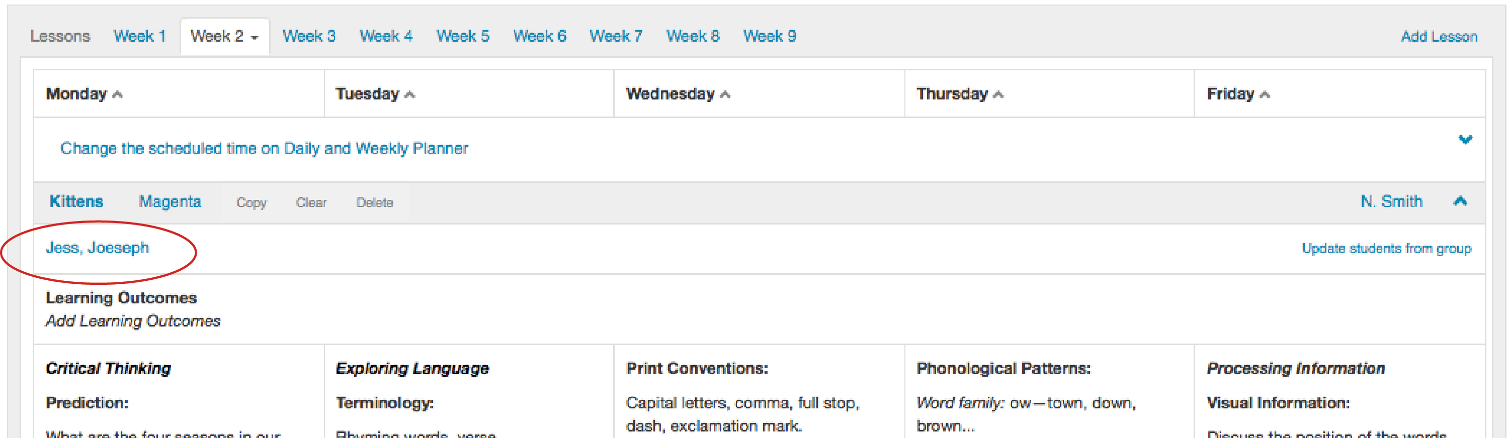 Your history will then show in Week 2, Jess and Joeseph were in the Kittens group at Magenta level and what they were taught.