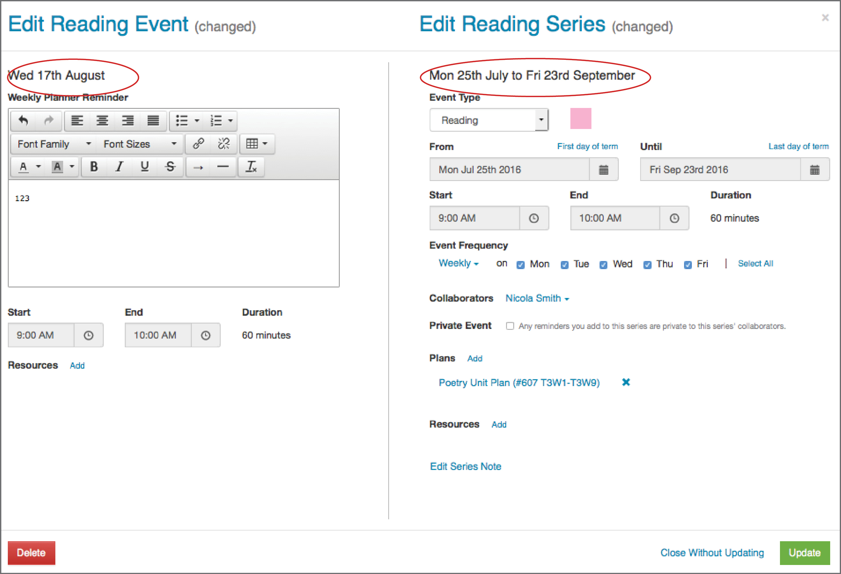 - To change details for just the Event (Wed 17th August) change the detail on the left side of the popup.