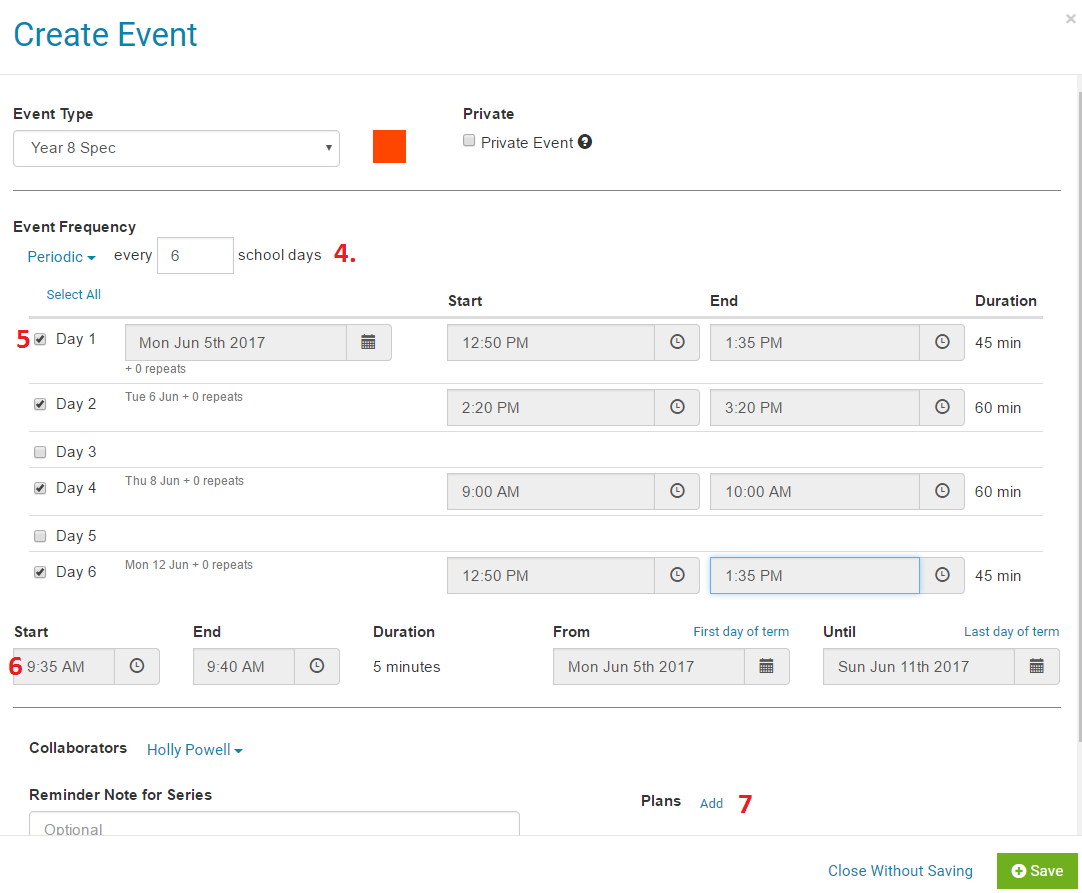 If your school’s timetable has events at different times on different days, as in the case of most secondary timetables. Then you may find it helpful to create a periodic event series on your Weekly Planner.