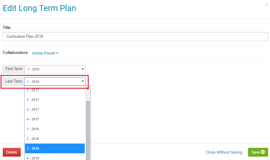 2. In the plan edit screen change the Last Term to extend the time-frame then click Save.