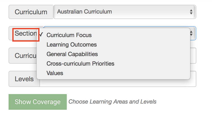 - You will now be able to choose your selected curriculum areas under the Section filter of the curriculum coverage tool.