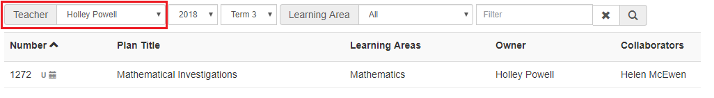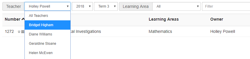 Step 2. The filters automatically default to showing your name in the Teacher filter. Click on your name or the arrow to view a drop-down of all the teachers in the school.