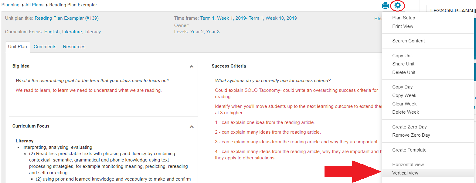 2. Click on the Cog icon at the top of your Plan and select Vertical view from the drop down menu.