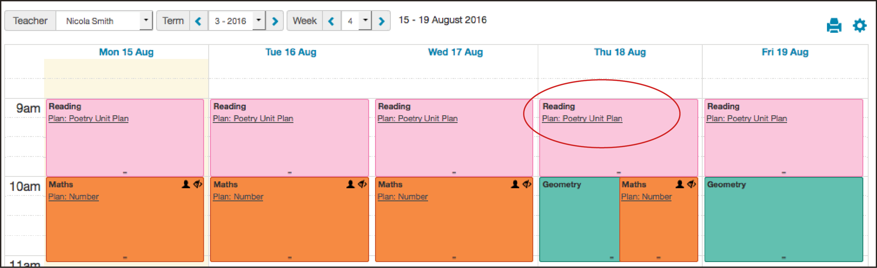 If you have linked or ‘scheduled’ your plan to an event on your Weekly Planner on the Unit Plan Setup page, your plan title will appear under the event name on your Weekly Planner. Simply click on the plan title to be taken to your master plan.